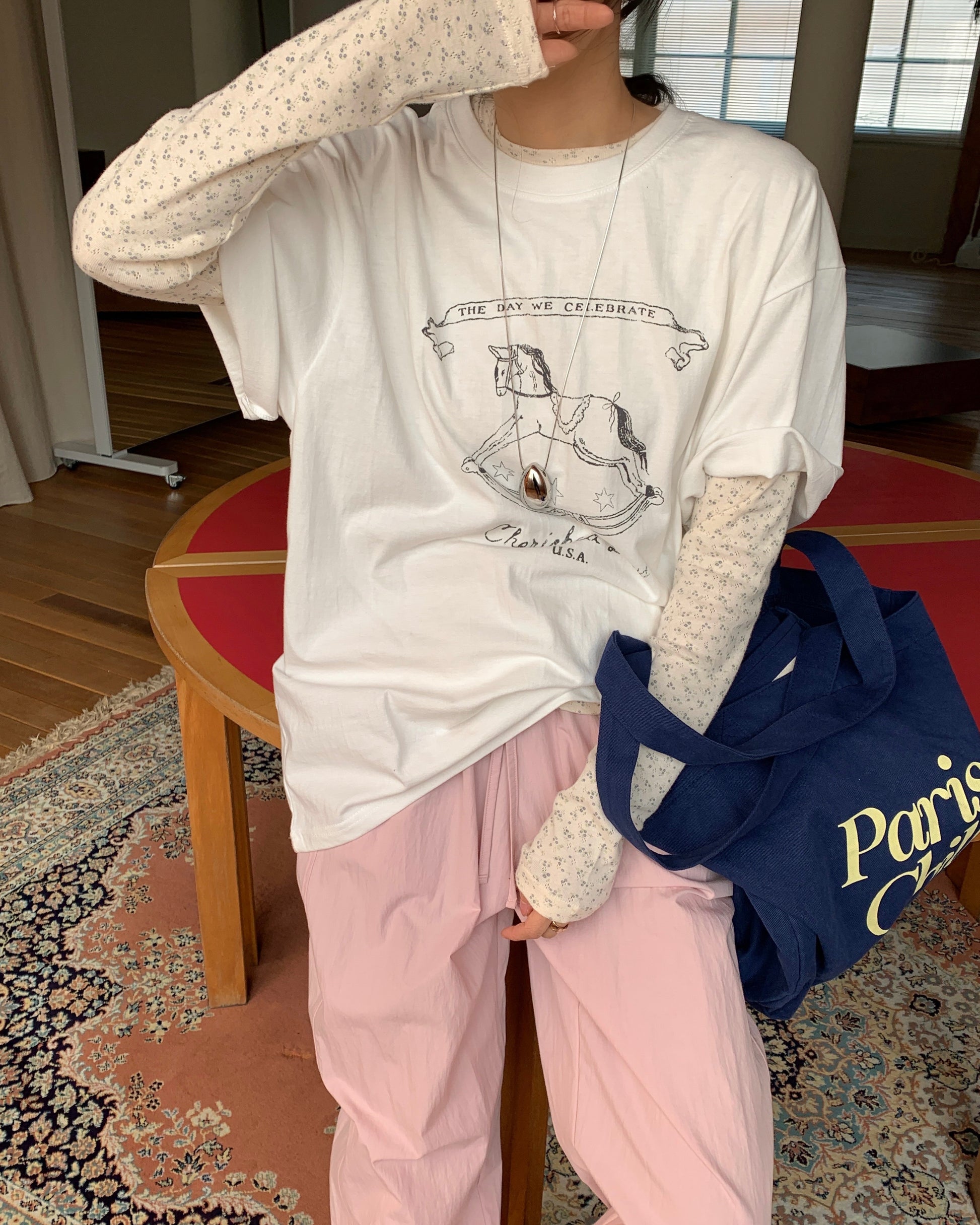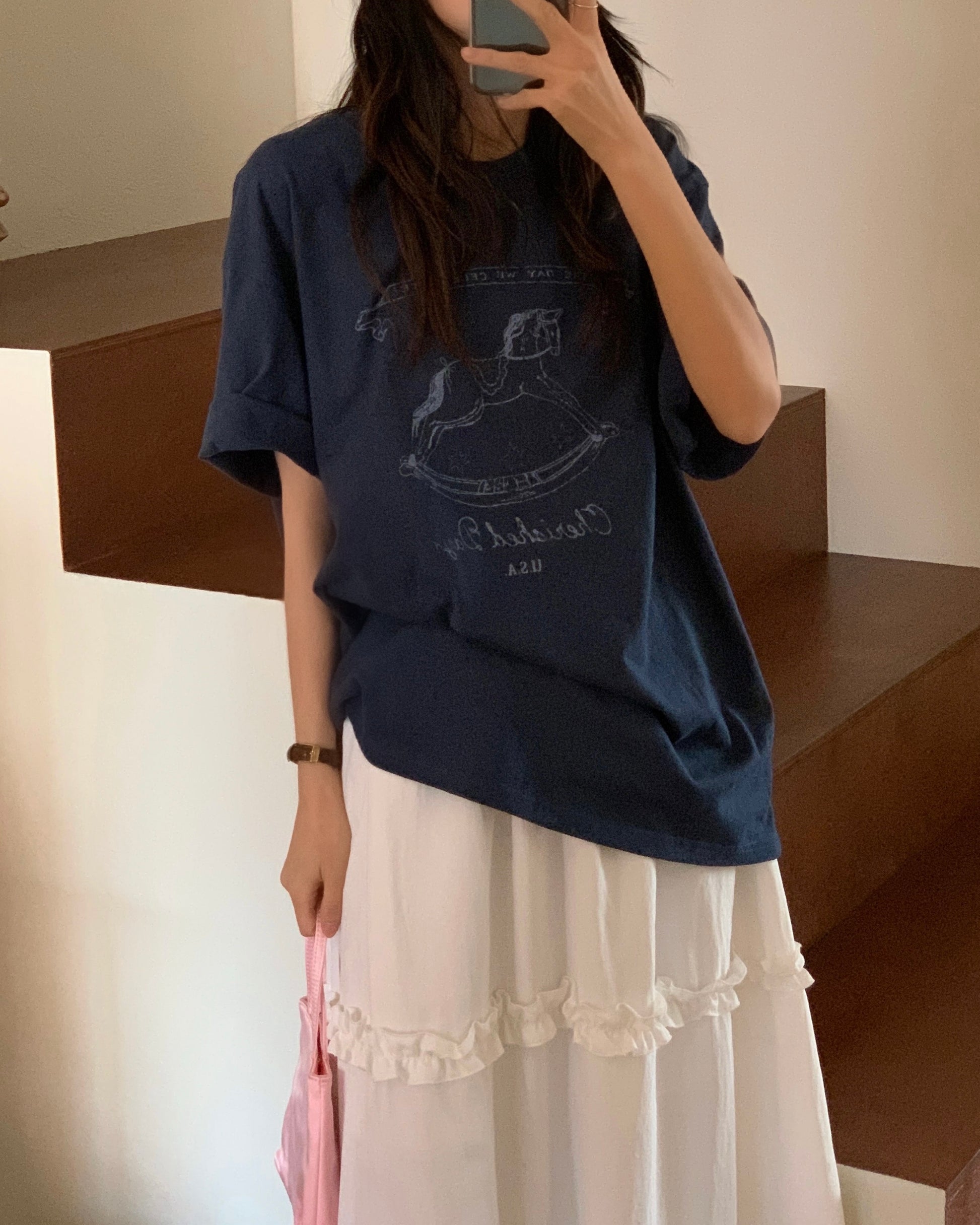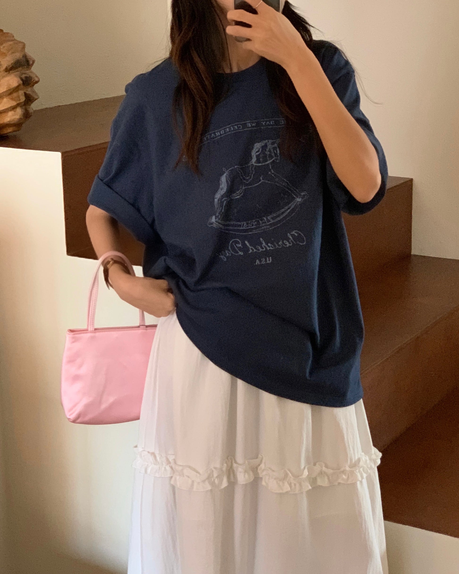 Embrace nostalgic charm with our Cherished Rocking Horse Tee, featuring a delicate vintage-inspired illustration of a rocking horse framed by a celebratory banner and subtle "Cherished Days U.S.A." detailing. Crafted from soft, breathable cotton in a relaxed oversized fit, it offers everyday comfort with a touch of whimsical sentiment. Ideal for layering under cardigans or wearing solo for that effortless, heartfelt everyday look.
