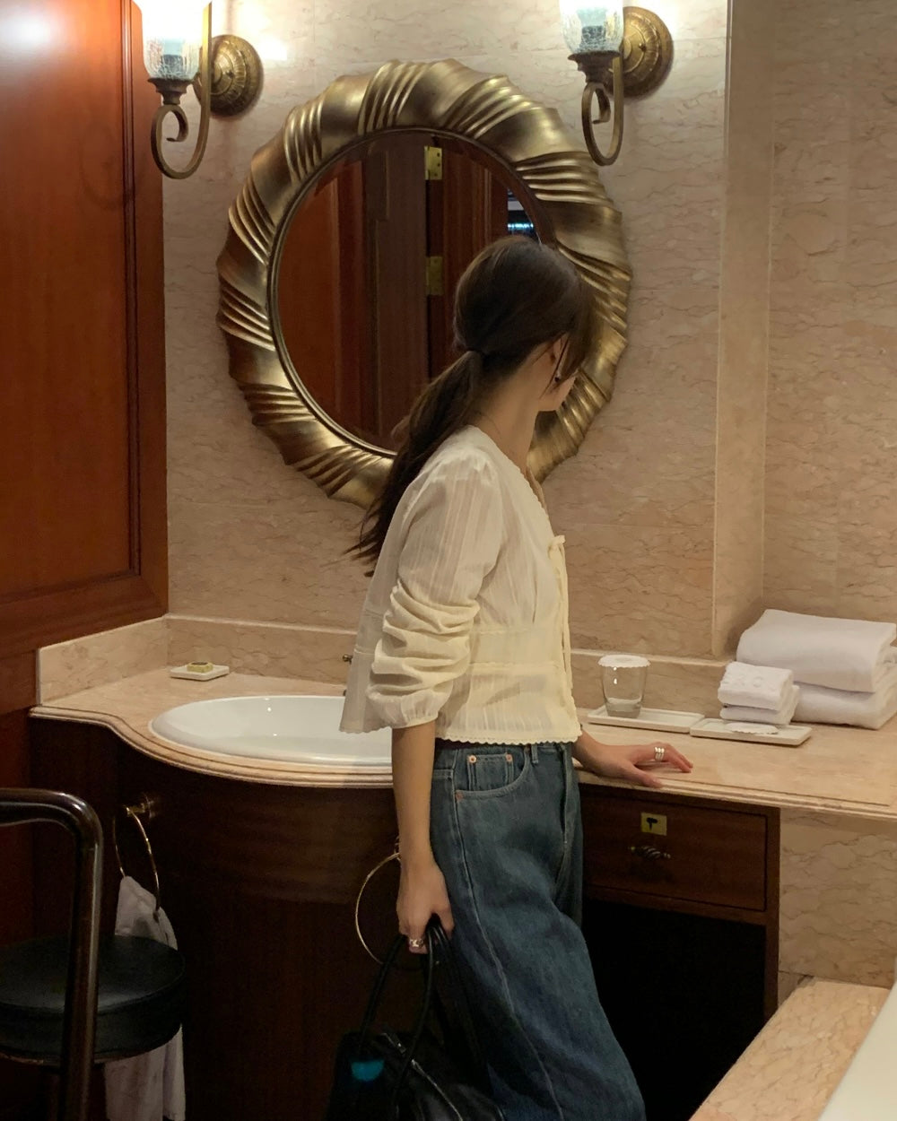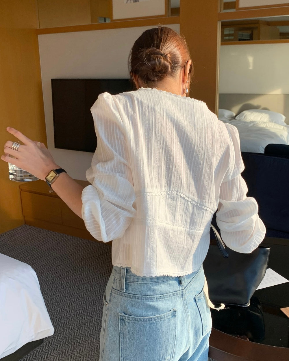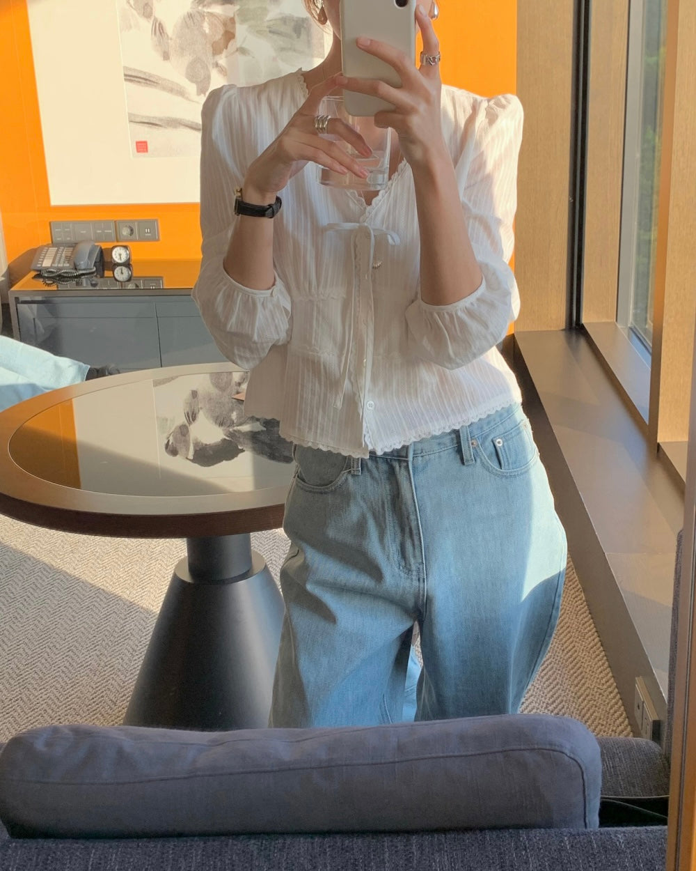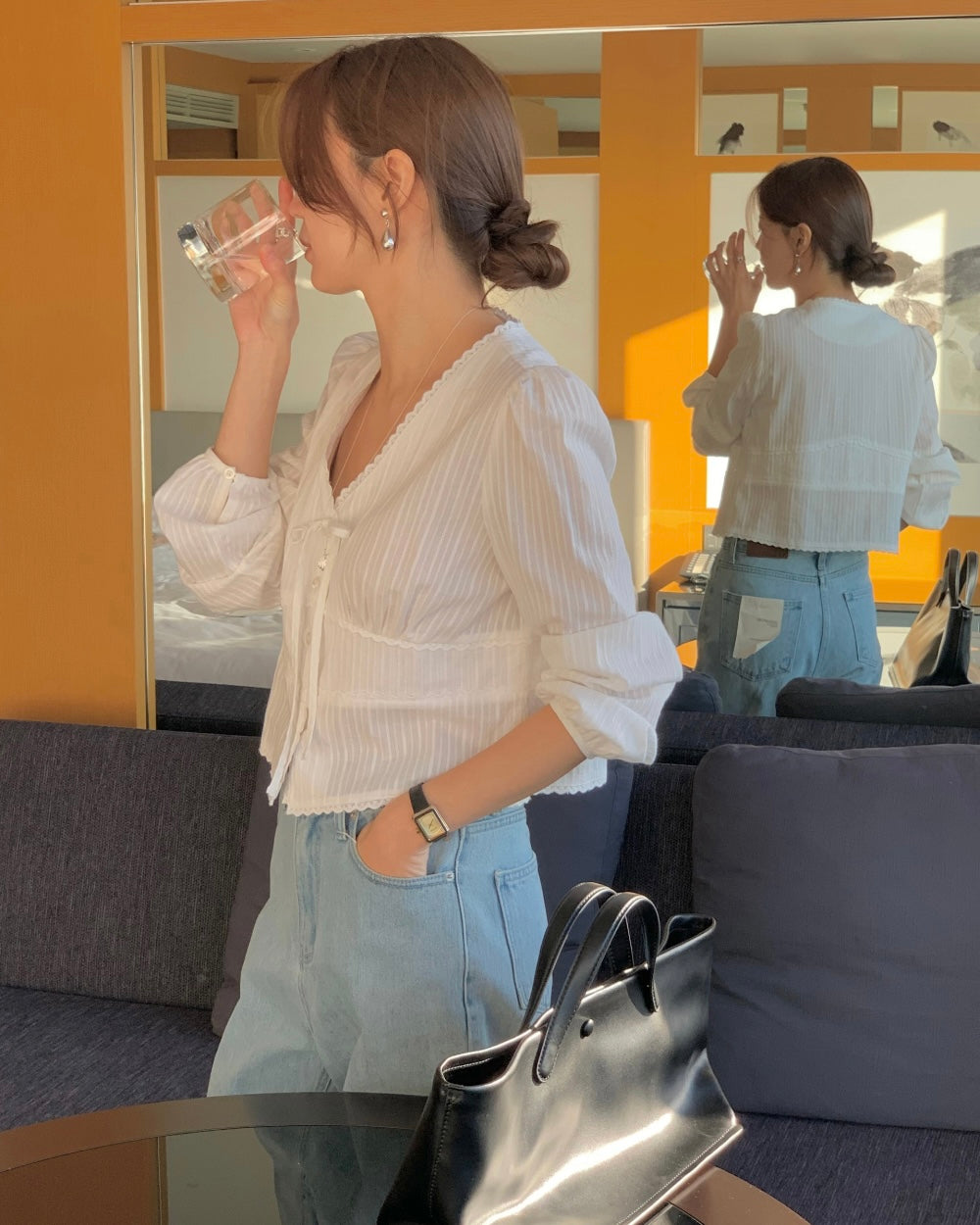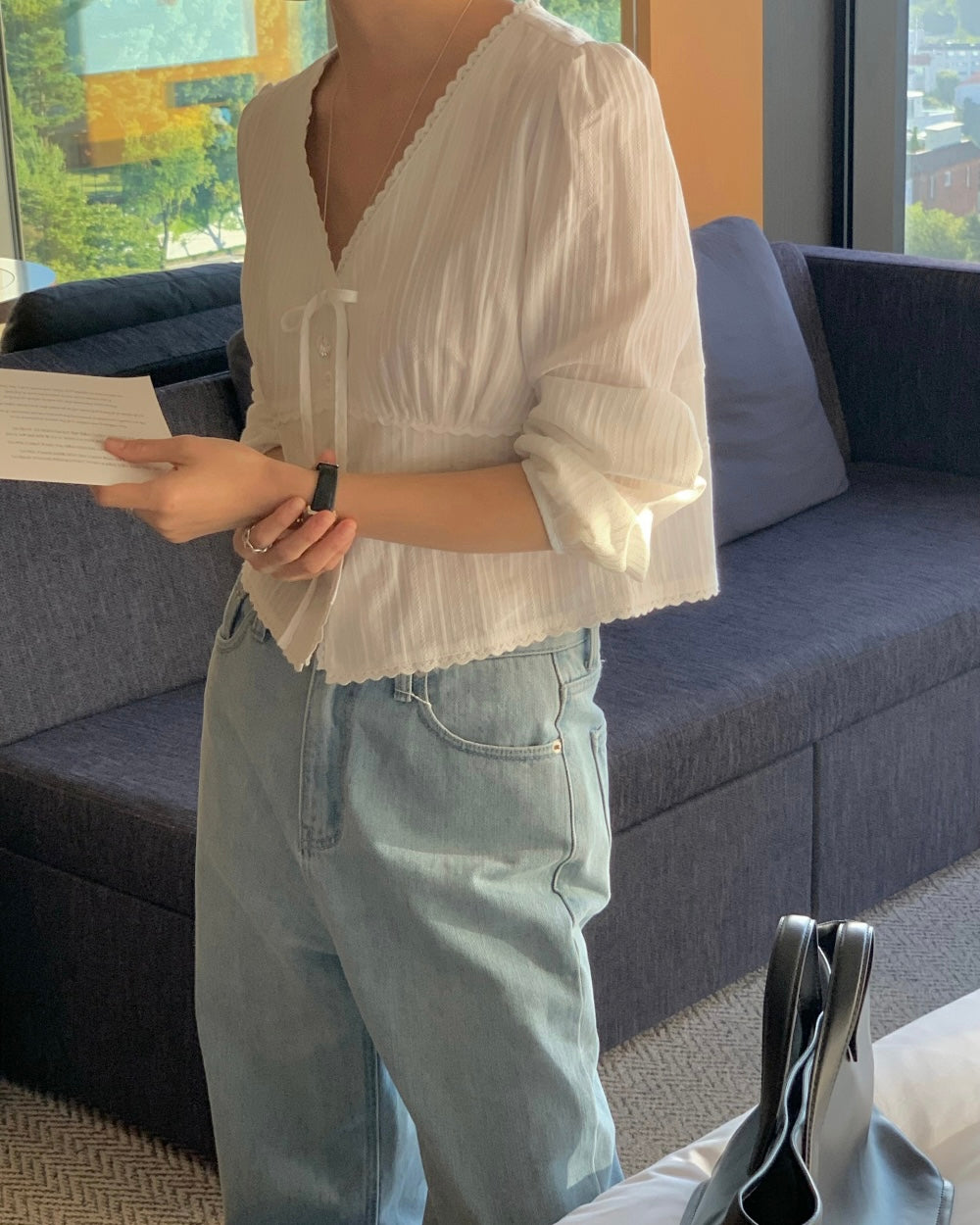 Embrace coquette charm with this dreamy lace blouse. It features romantic puff sleeves, delicate scalloped lace trims, and a sweet front ribbon bow tie. The plunging V-neckline and button front create a flattering, feminine silhouette. Subtle pleats blend Victorian romance with modern whimsy. Style it alone on warmer days, layered under a cardigan or vest for extra warmth.