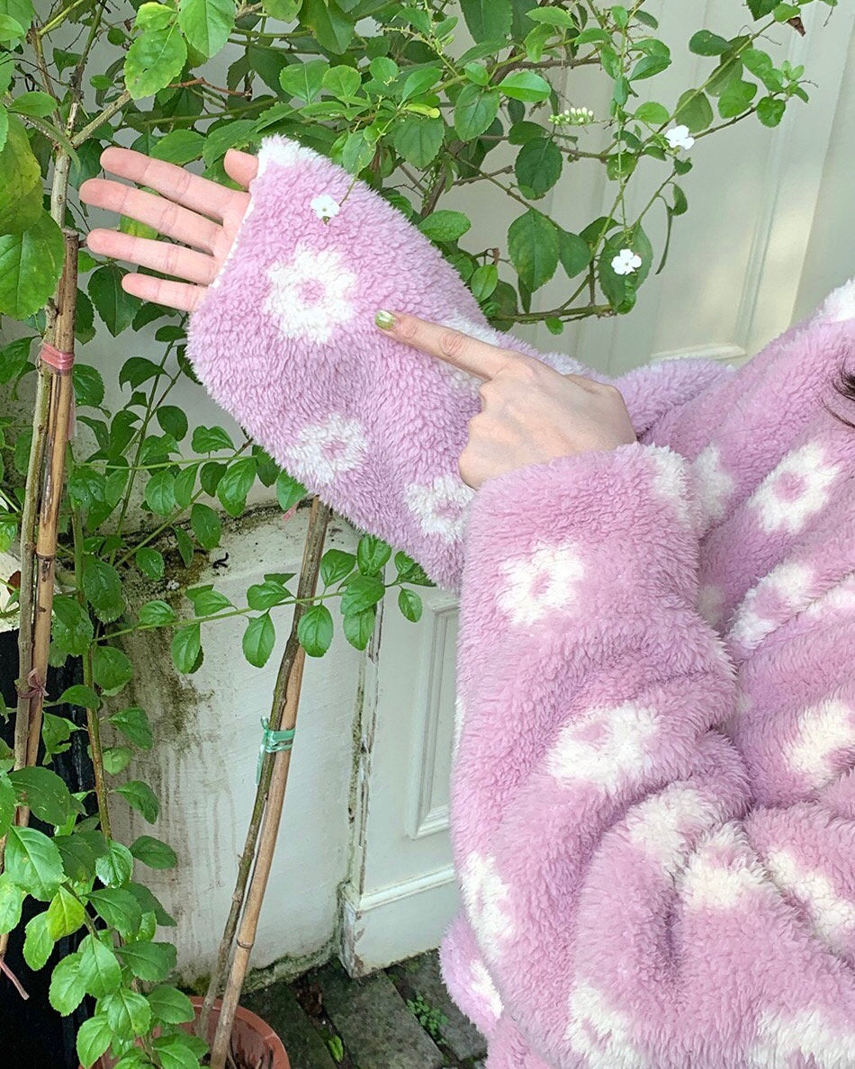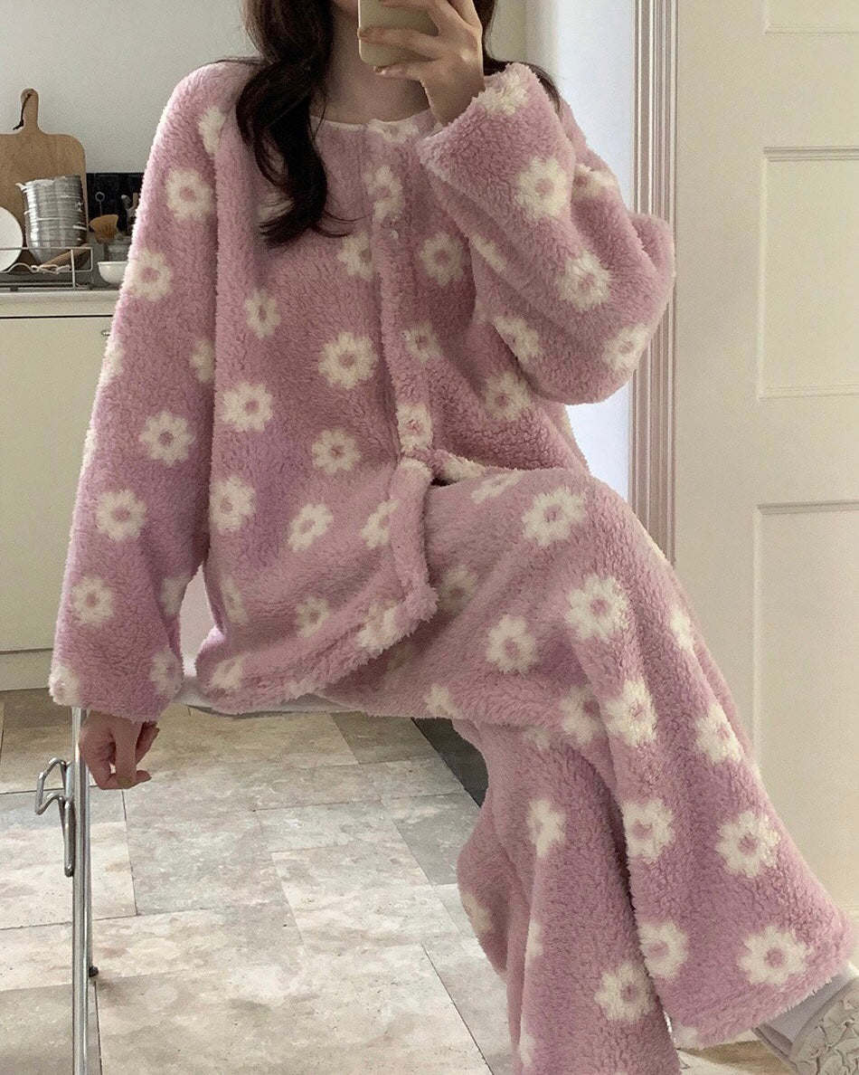Bloom into comfort with the Daisy Fleece Pajama Set. Super soft fleece fabric featuring an adorable all-over daisy flower pattern, perfect for cozy nights and lazy mornings. The set includes a button-up cardigan top with a relaxed fit and wide-leg pants with an elastic waistband for ultimate comfort. Lightweight yet warm, ideal for lounging or sleeping in style.