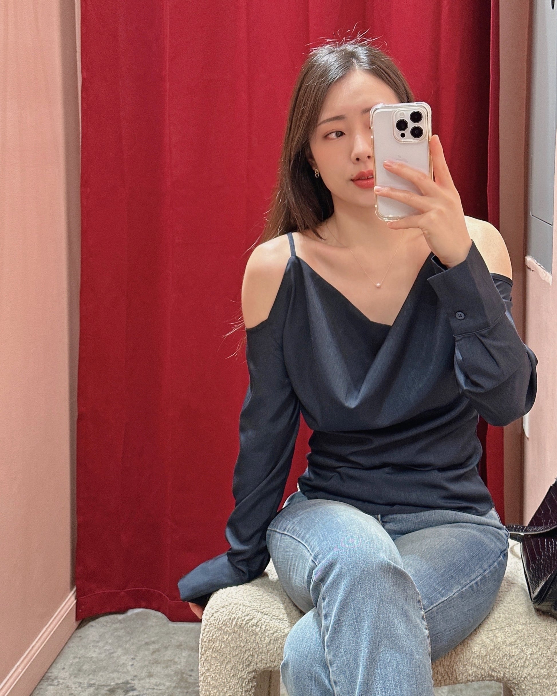 Luxurious satin blouse with a soft draped cowl neckline and elegant cold shoulder cutouts on both sides. Long sleeves and subtle skin reveal create a feminine, flattering silhouette. Features a discreet side zipper for easy on and off. Perfect for casual year-end gatherings and holiday parties – effortlessly chic without being over-the-top. Pair with jeans for daily wear or dress up for subtle elegance.