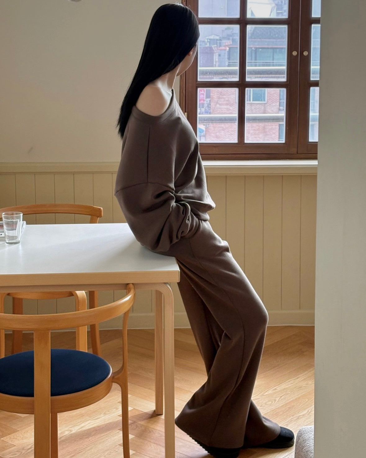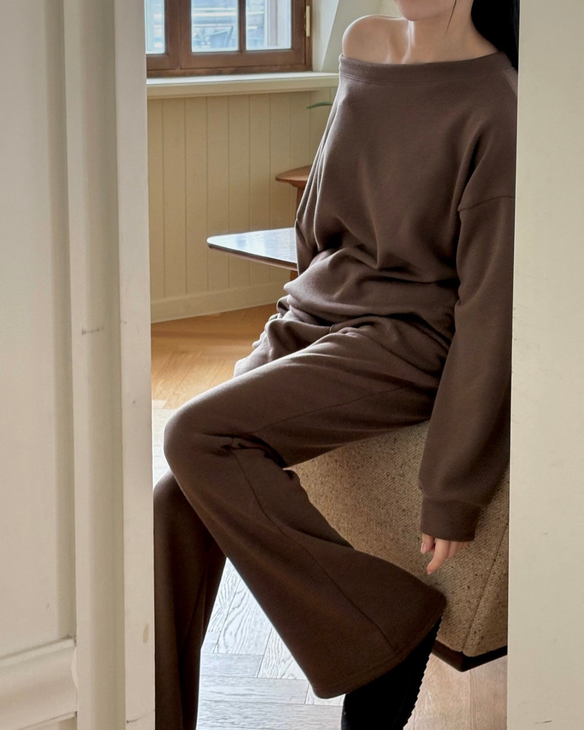 Cozy fleece lining in rich brown and black, wide boat neck oversized top (style off-shoulder or centered), paired with flattering wide-leg pants. Effortless warmth for winter days in or out. Soft inner fleece lining keeps you cozy without bulk, while the wide boat neck frames the collarbone beautifully. Wear it centered for classic elegance or slide off one shoulder for a relaxed vibe.