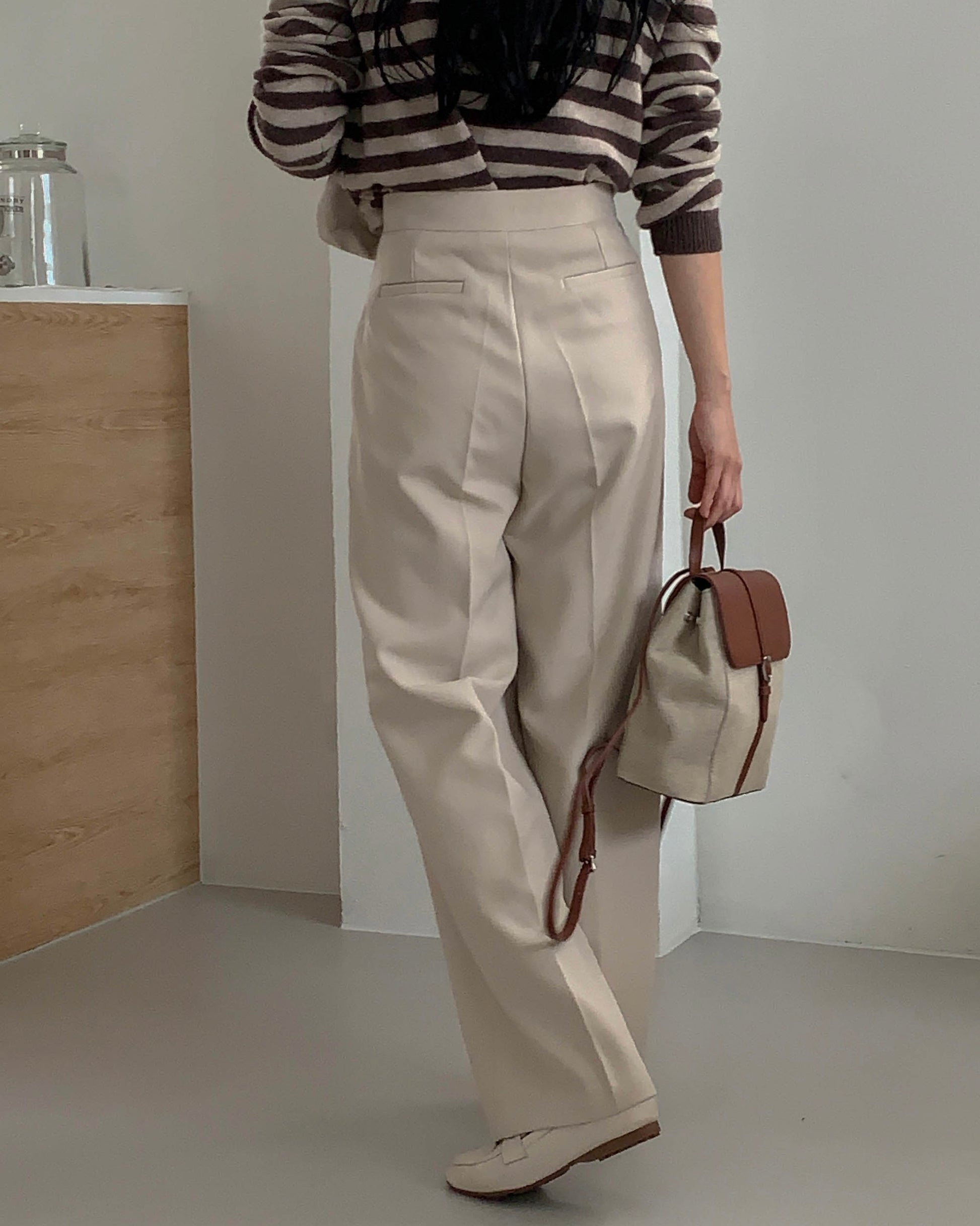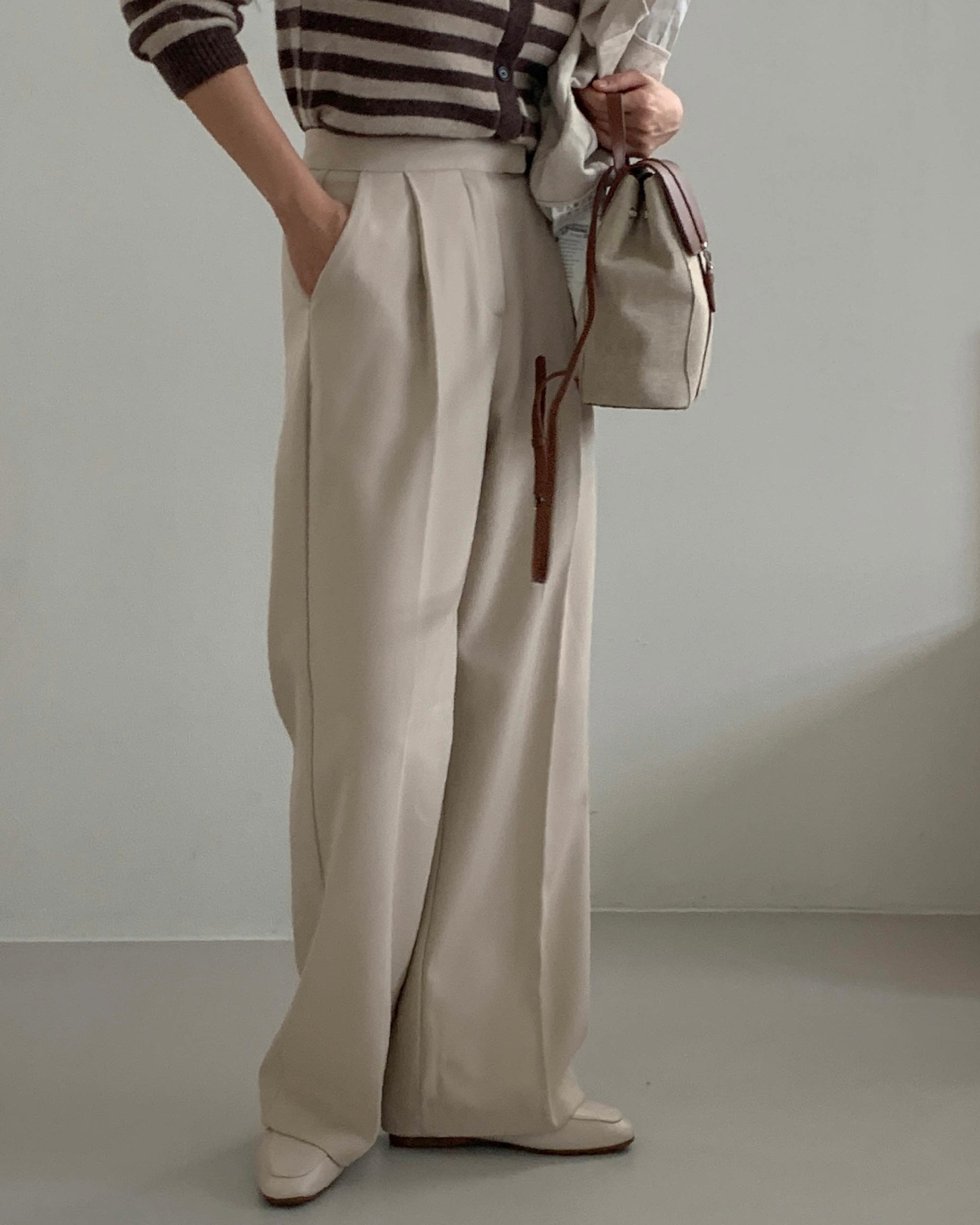 These high-waisted wide-leg trousers are fully lined with soft fleece for exceptional coziness, while the substantial weight and gentle drape create a structured yet fluid silhouette. Deep front pleats and a clean, full-length cut elongate the legs effortlessly, making them the perfect balance of tailored polish and all-day comfort.