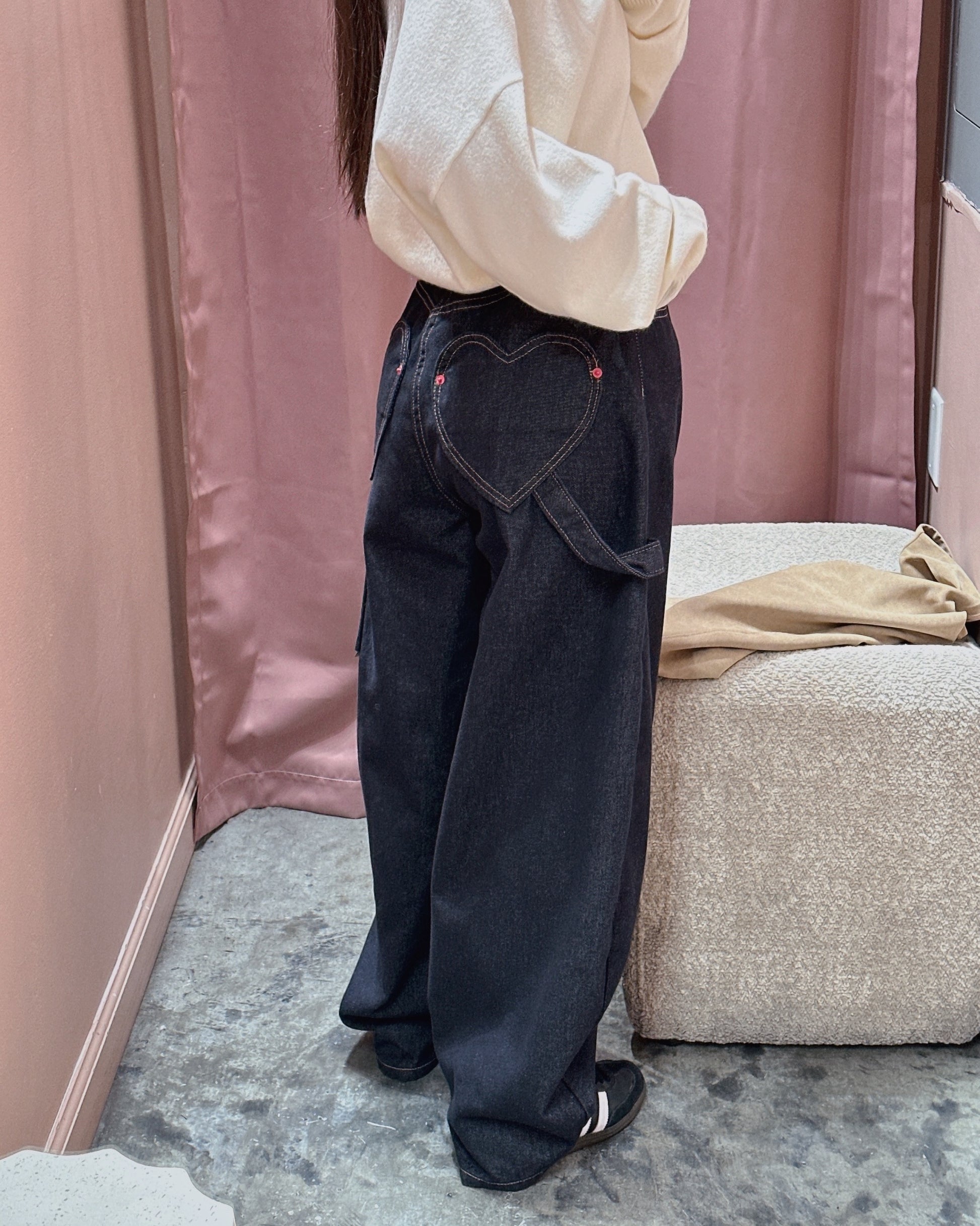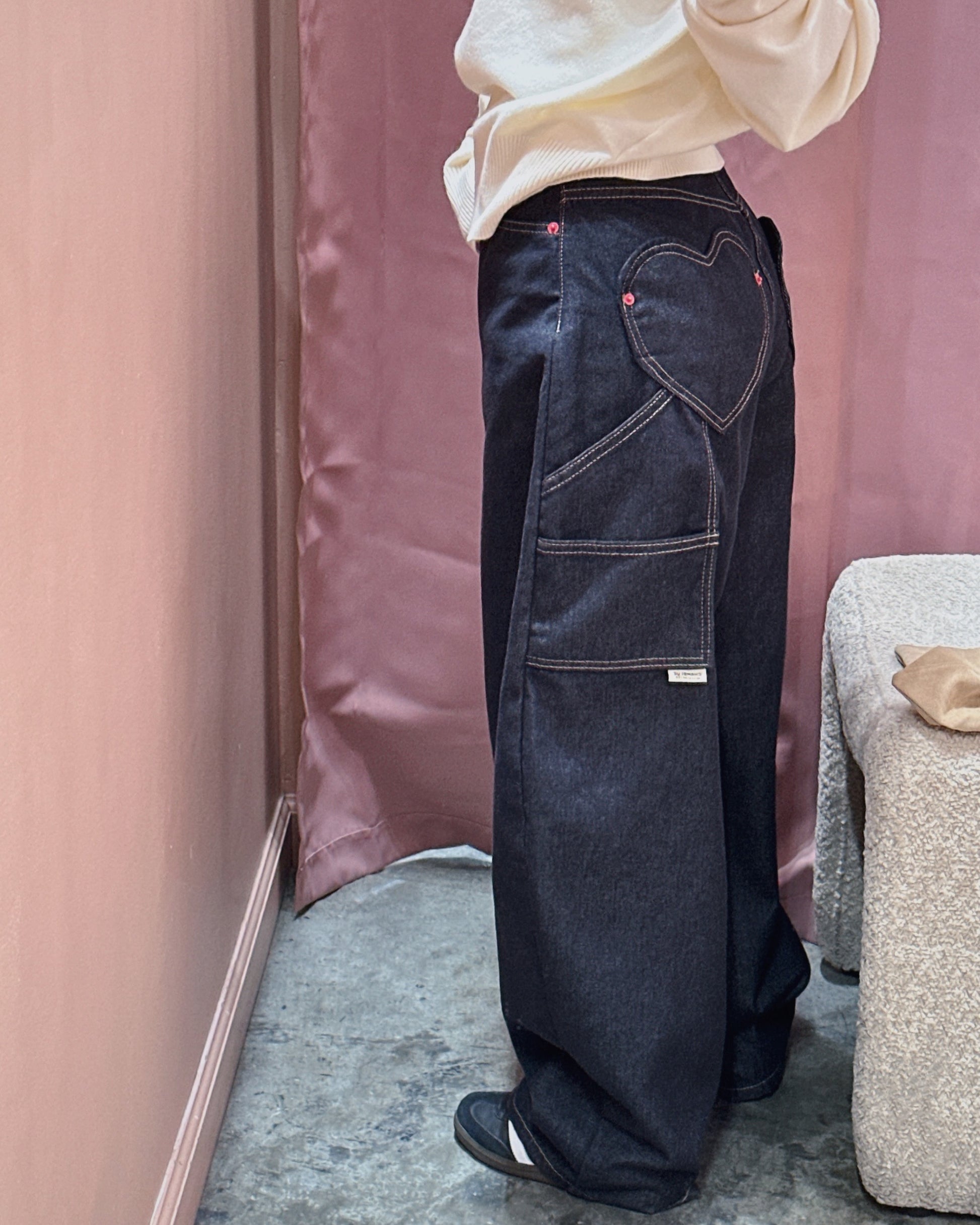Crafted from non-fade denim, these jeans are designed to maintain their deep, clean color wear after wear. The standout heart-shaped back pockets add a subtle yet playful detail, giving the classic denim silhouette a unique twist.