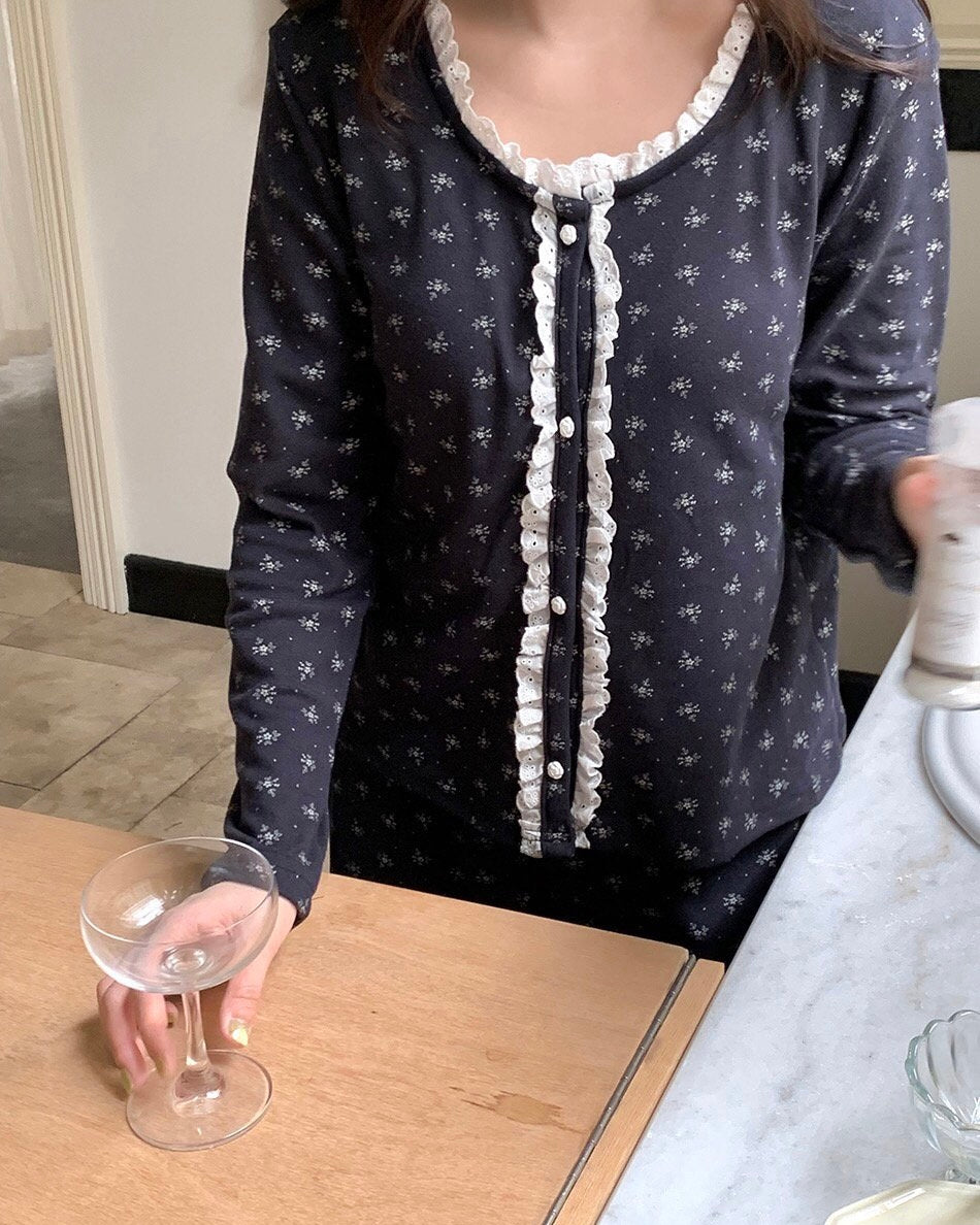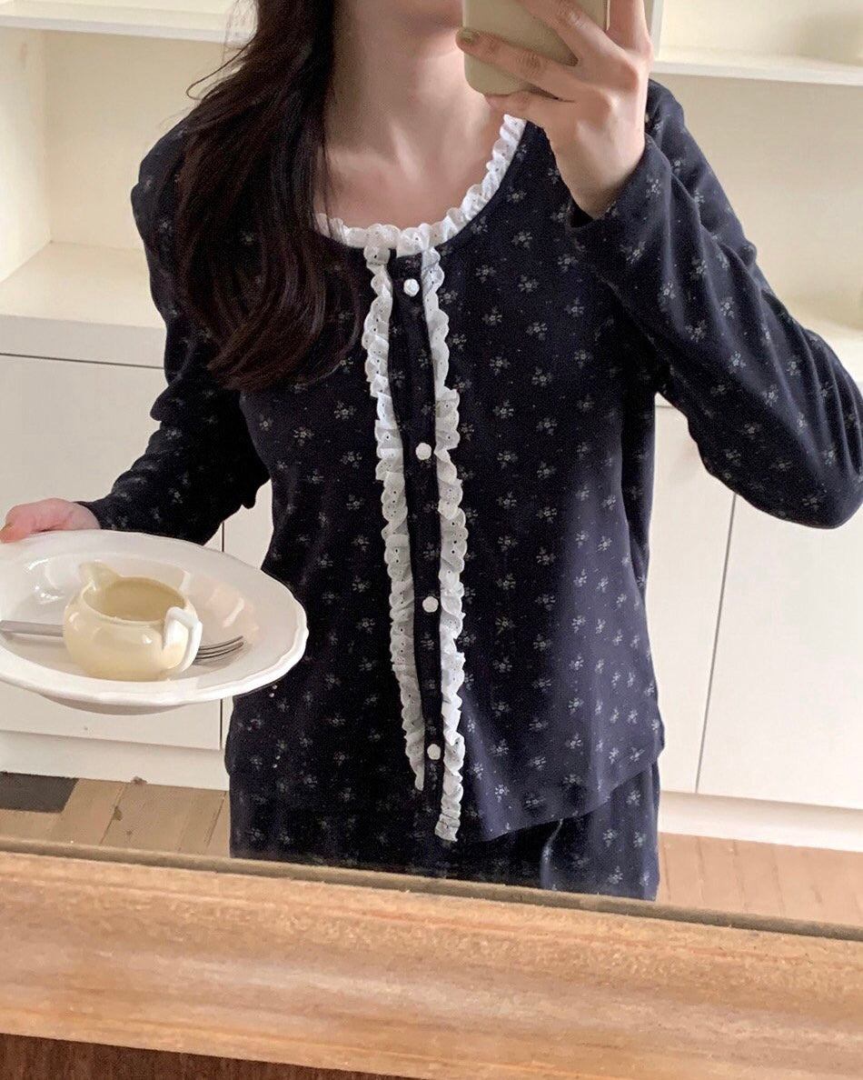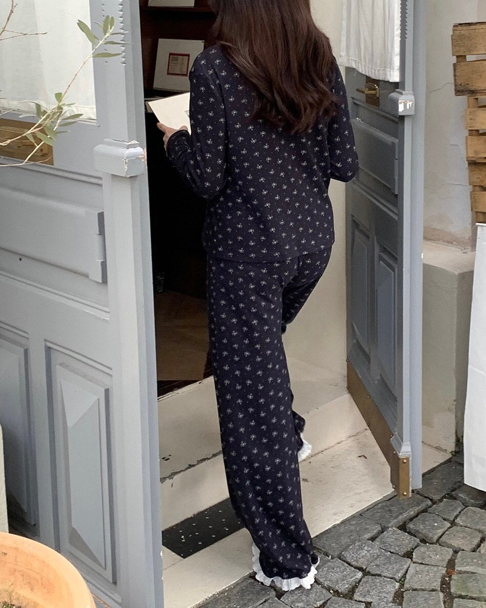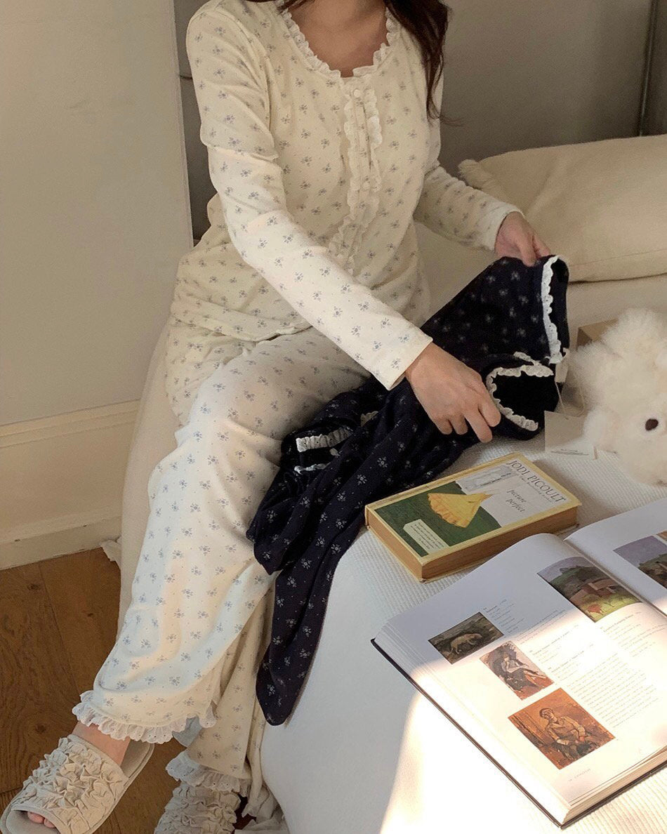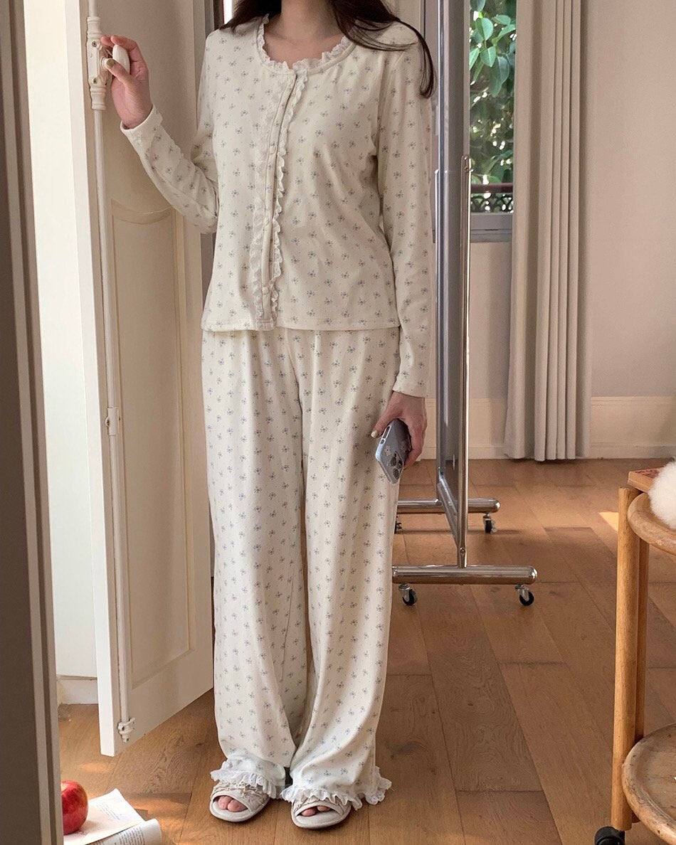 Indulge in ultimate comfort with our Peach Skin Ditsy Floral Pajamas. Crafted from ultra-soft, velvety peach skin fabric that's gentle on the skin and perfect for spring lounging. The top features built-in chest pads for added support and a sweet ruffled lace trim, while the wide-leg pants include convenient side pockets. Adorned with delicate tiny floral print for a feminine, cozy vibe. Sweet dreams await!