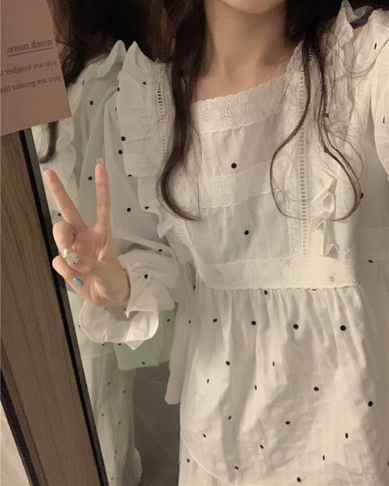 Drift into dreamy comfort with our Polka Dot Ruffle Pajama Set, crafted from soft, breathable cotton blend fabric adorned with playful black polka dots and delicate lace trims. The babydoll-style long-sleeve top features a flattering square neckline, romantic frilled cuffs, and intricate lace inserts, while the flowy wide-leg pants boast ruffled hems for an extra touch of whimsy.