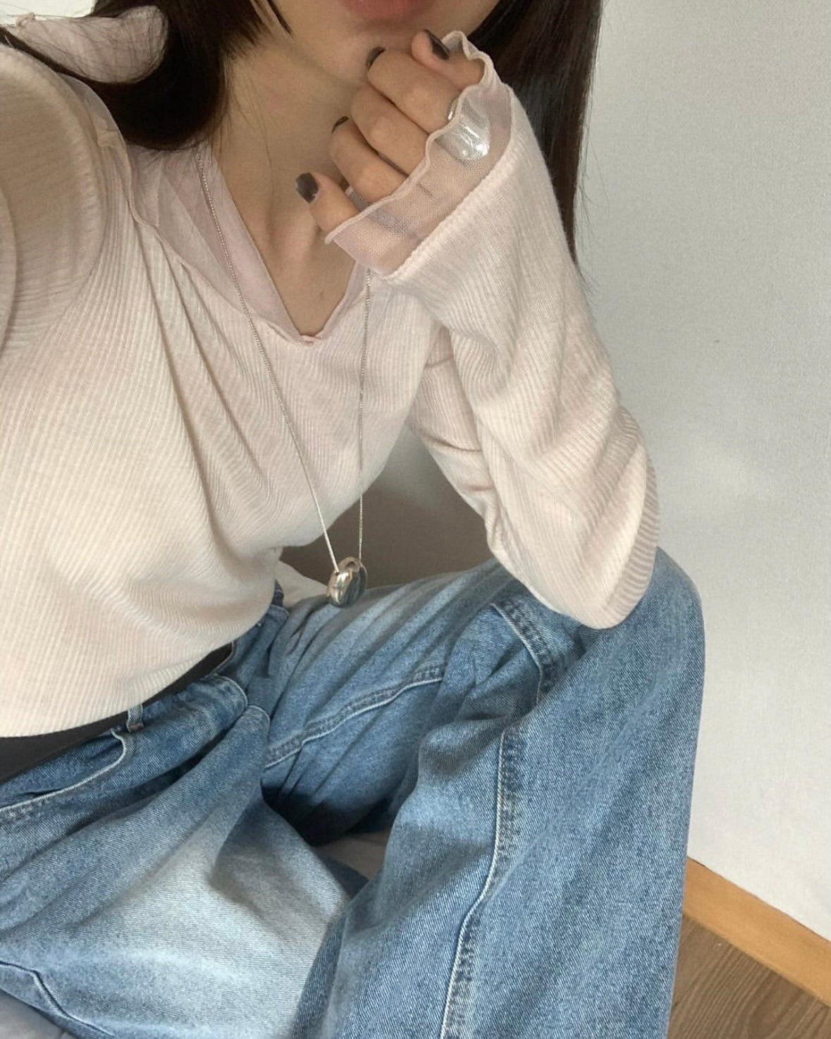 The semi-translucent details offer a refined layering effect, making the silhouette feel effortless and understated. Its breathable texture makes it versatile across seasons—easy to pair with denim, skirts, or worn beneath outerwear for a quiet, elevated look.