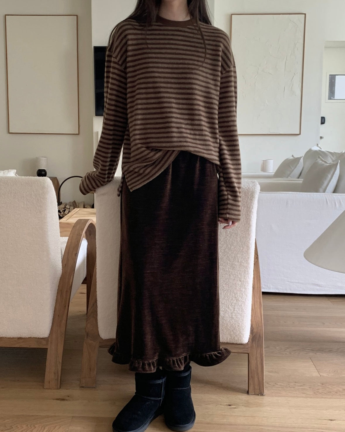 Made from soft, lightweight velvet that's smooth and cozy without feeling heavy, perfect for staying warm in cooler weather. The playful ruffled hem creates a flowy, flattering A-line silhouette, while the stretchy elastic waistband ensures easy pull-on comfort and a flexible fit.