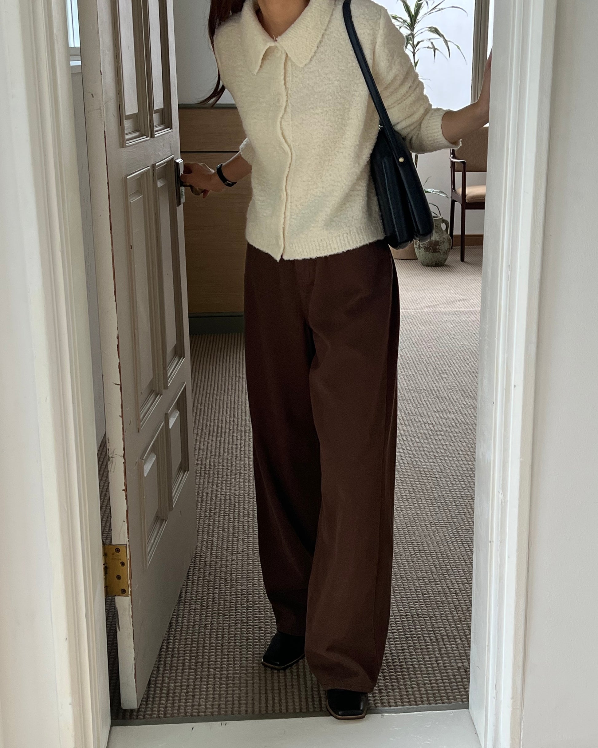 Crafted from a soft peached fabric, these wide-leg pants offer a smooth, warm touch and a relaxed silhouette. The matte texture adds a refined, minimal look, making them perfect for effortless everyday styling. Comfortable yet polished, they pair easily with knitwear, shirts, and outerwear throughout the season.