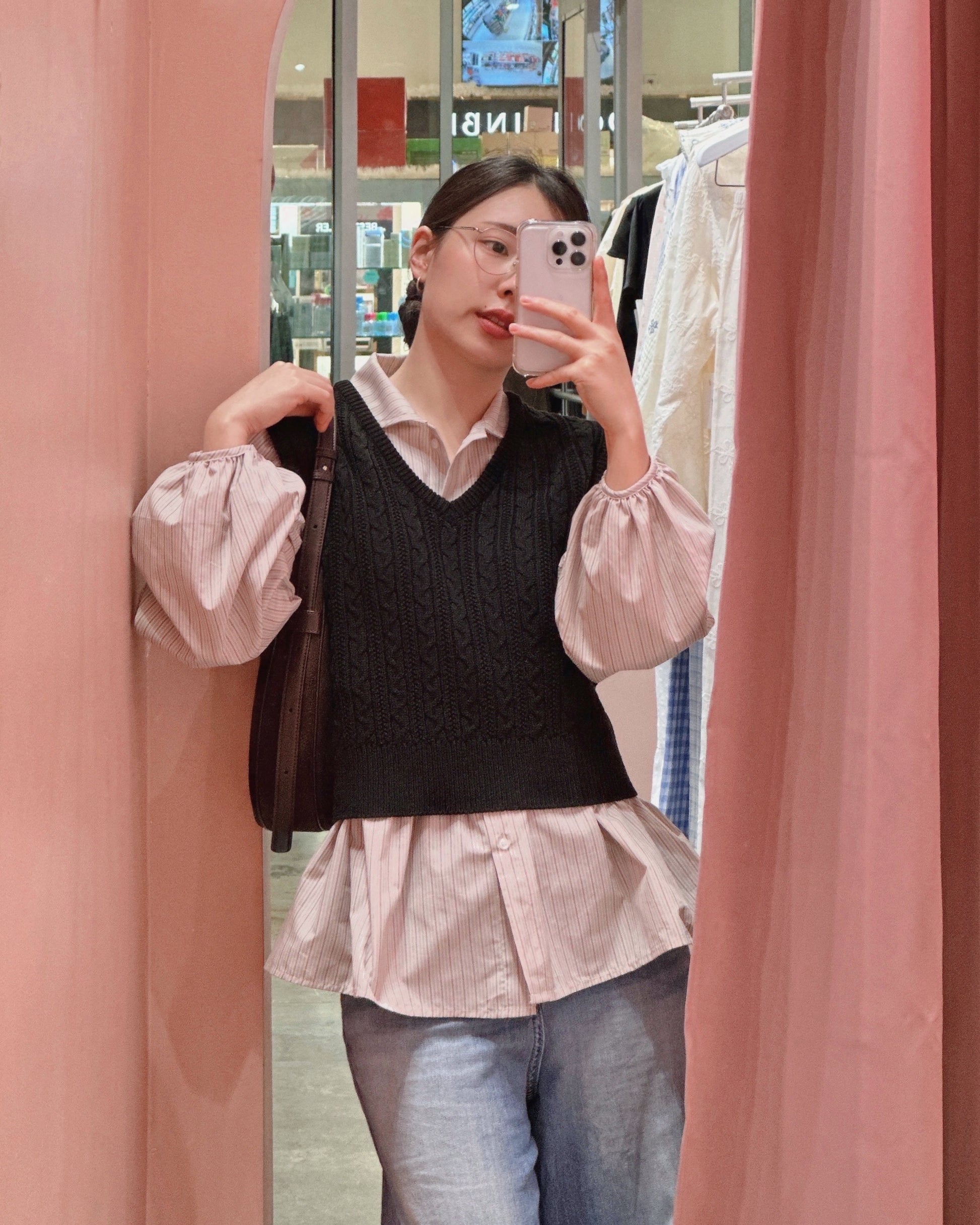 this piece brings a touch of charm to your everyday look. It pairs beautifully with a cozy knit vest or cardigan for a classic layered outfit, and also looks effortlessly cool under an oversized suede or leather jacket, a perfect nod to this season’s trend.